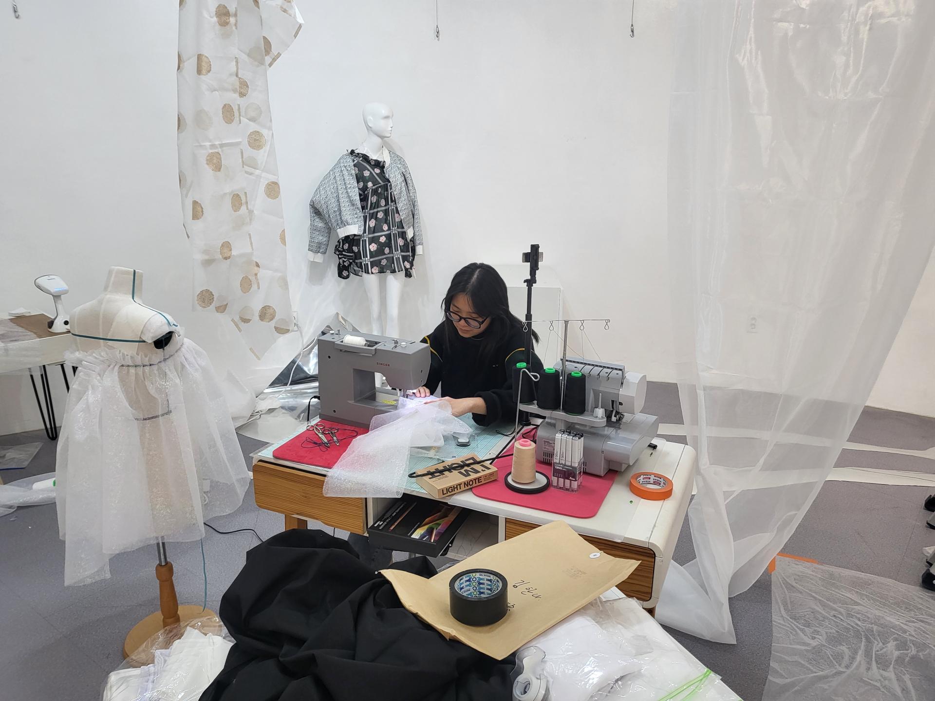 저희는 일상을 중심으로 영감을 얻어요. 각자의 이야기를 자기만의 방식으로 표현해요. 저는 패션을 전공했거든요. 디자인적 요소가 강하고 옷은 입어야 하는 것이니까 실용적인 측면도 생각해요. 그렇지만 회화를 전공한 다른 작가의 작품을 보면 시선이 또 다르거든요. 같은 보령에 사는 데도요. 그렇게 모여서 서로의 이야기를 작품으로 표현하는 게 재미있어요.
