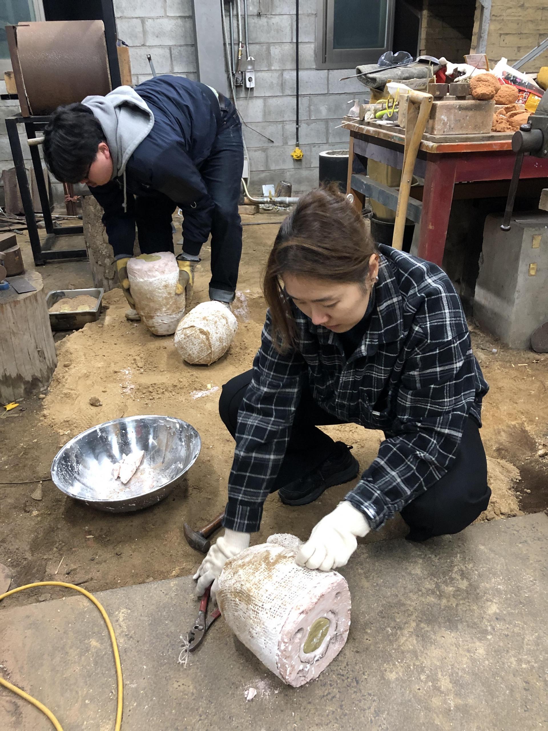 처음엔 산이나 절에서 발견되는 돌탑에서 영감을 얻어 작업을 시작했어요. 이후에는 빈 터에 남겨진 탑들을 유심히 보기 시작했어요. 차곡차곡 쌓인 누군가의 소원, 남겨진 탑이 지켜보았을 사람들, 기도, 기억… 부여에 온 뒤에는 현존하는 많은 문화유산에서 영감을 얻어요. 또 주조하는 행위 자체에서 영감을 얻기도 해요. 주물기법의 과정은 계속되는 반복으로 켜켜이 쌓이는 우리 삶과 닮아있어요. 반복적인 삶에서 자신만의 인생을 살아가고자 노력하는 것처럼 주조작업도 제게는 반복 속에서 작품을 찾아내는 여정이거든요.
